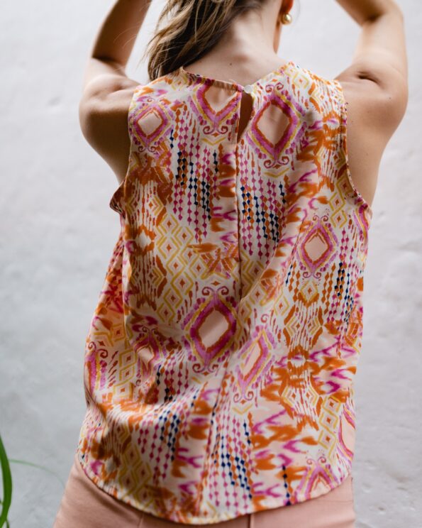 Blusa tipo musculosa con escote redondo. Botón superior trasero para prender.