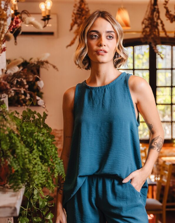 Blusa sin manga, escote redondo y botón en espalda superior.