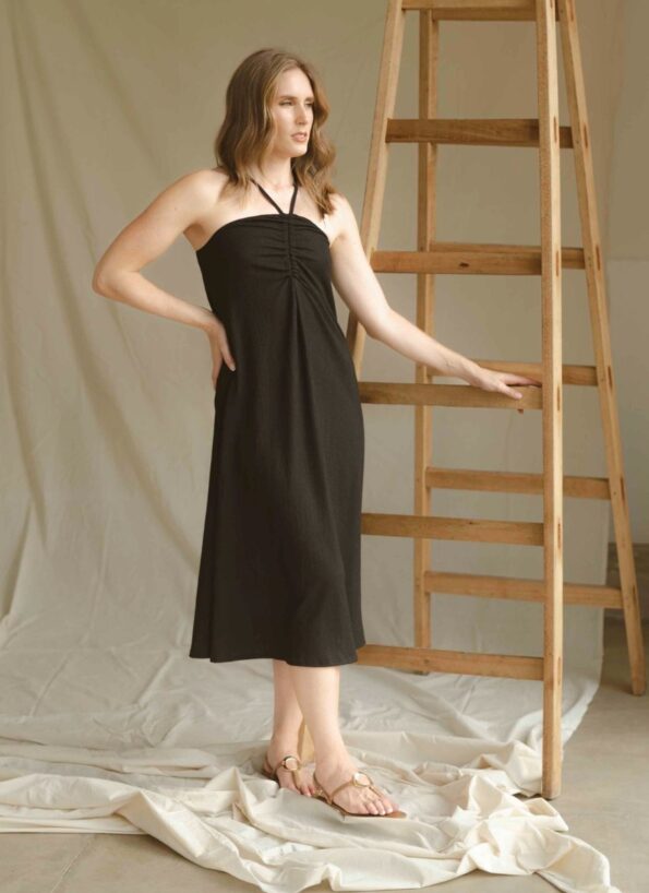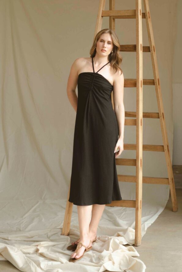 El vestido Ana midi es super comfy y versátil. Perfecto para acompañarte en tus días. Tiene goma en el escote y tiras regulables para mayor comodidad.