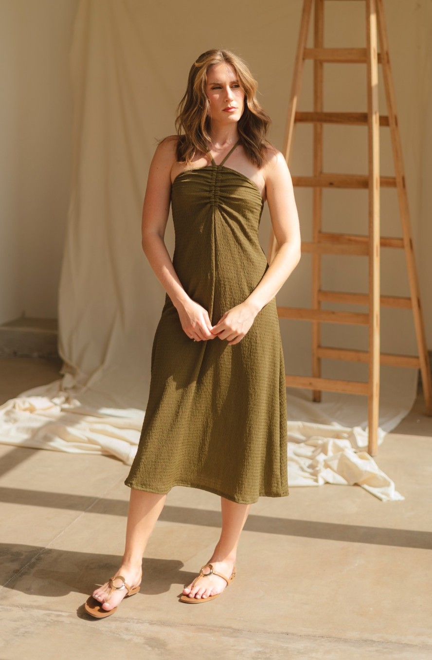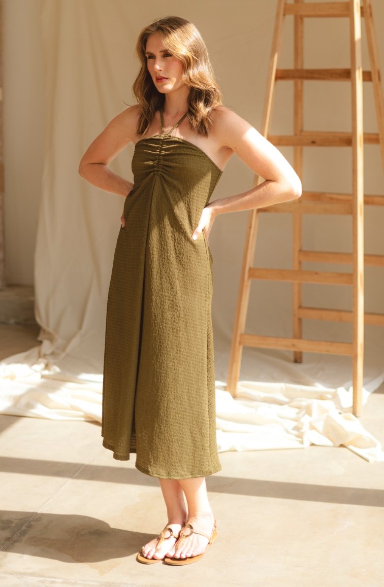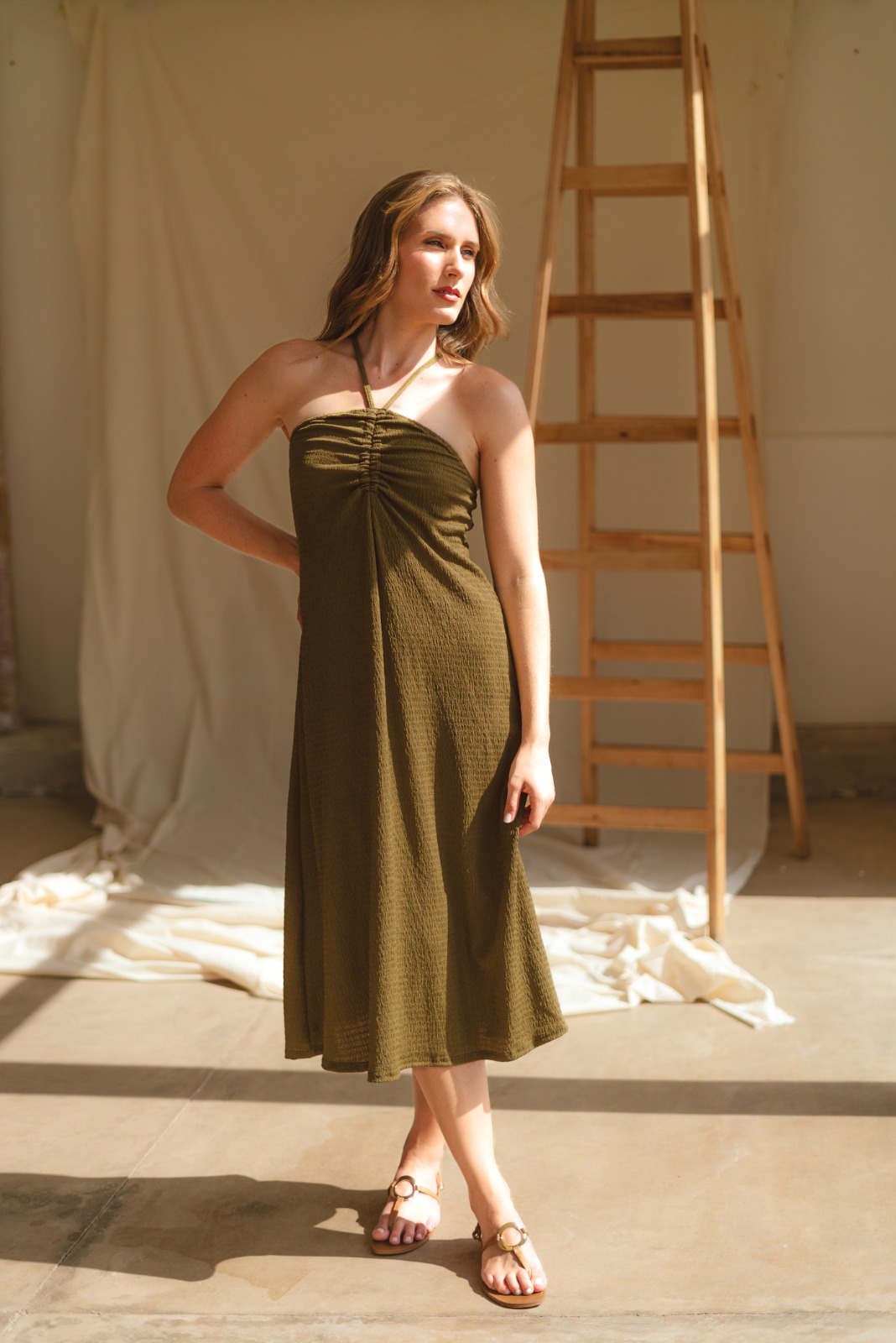 El vestido Ana midi es super comfy y versátil. Perfecto para acompañarte en tus días. Tiene goma en el escote y tiras regulables para mayor comodidad.